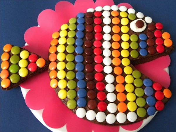 ¡Esta otra tarta pez es a prueba de malas cocineras! Es tan fácil como preparar un bizcocho, cortar un trángulo que formará la boca, y con el mismo triángulo haremos la cola. Luego la cubrimos con alguna crema de chocolate, y recubrimos con confites de colores. Podemos hacer el ojo con un chuche blanco, y en el centro un confite de chocolate. ¡Facilísima!