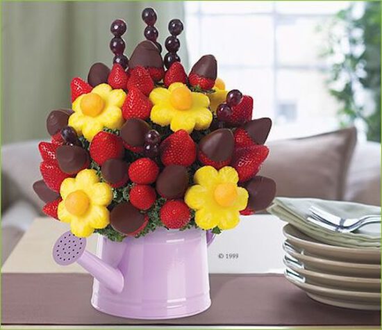 ¡Qué preciosidad la regadera con frutas de la primera imagen! Para hacerla necesitamos colocar dentro de la regadera (o jarrón, maceta, etc) un trozo de esponja floreal en el que pincharemos los palillos. Luego preparamos la fruta (lavando, cortando, etc) y la vamos pinchando en los palillos. Algunas, como las fresas o los arándanos, podemos bañarlos en chocolate, otras que hayamos cortado con un cortante en forma de flor las dejamos tal cual (Fuente: Pinterest)
