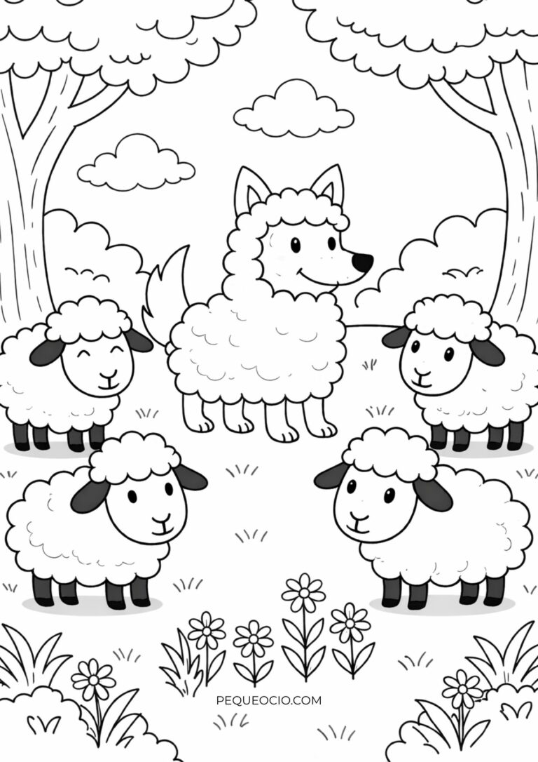 Fábula de Esopo «El lobo con piel de oveja» para colorear. Nos enseña que no debemos fiarnos solo de las apariencias y que la mentira y el engaño siempre acaban teniendo consecuencias.