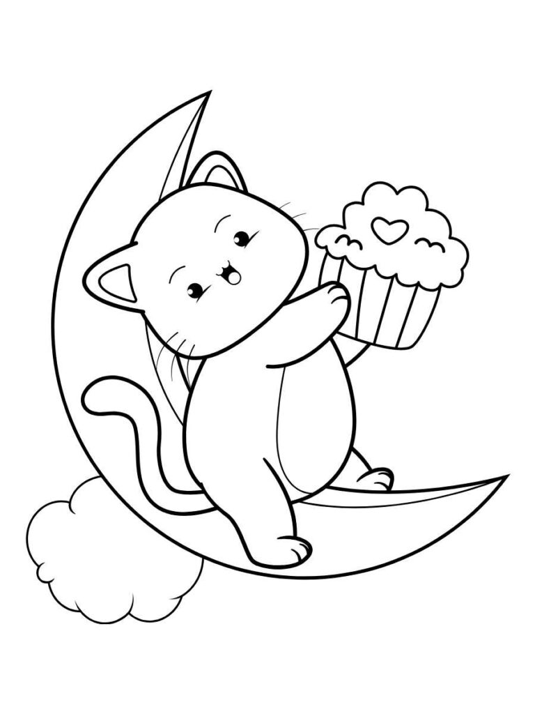 Dibujo para colorear de gato en la luna, ideal para niños. Una escena tranquila y mágica para disfrutar pintando antes de dormir o en clase.