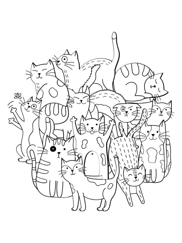 Dibujo para colorear con muchos gatos diferentes: grandes, pequeños, dormilones y juguetones. Ideal para que los niños se diviertan pintando sin parar