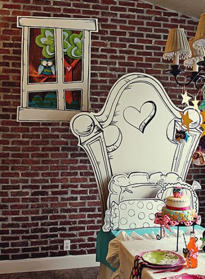 Dado que era una fiesta de pijamas, y las peques se quedarían a ver una peli y a dormir, ¿por qué no transformar la mesa en una cama?… Con cartulina, un buen rotulador negro y un cuter la madre de Rid transformó la mesa en esta preciosa cama, y para que pareciese que estaban en una habitación, también les hizo una ventanita, por supuesto con un búho vigilando.