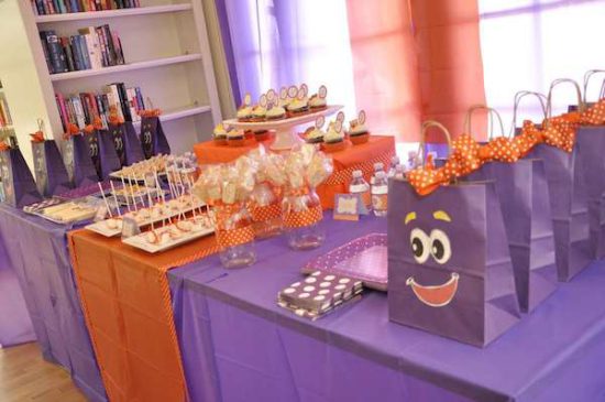 Una de las ventajas de Dora la Exploradora es que no tiene un color o paleta de colores predominante, los tiene todos. Esto nos permite organizar una fiesta alegre y multicolor sin tener que preocuparnos tanto por coordinar manteles, platos, globos etc. Aunque, si queréis seguir una paleta determinada, también podéis hacerlo y quedará muy bien, como en el caso de la imagen principal donde predominan el morado y el naranja (fuente: Catch My Party)